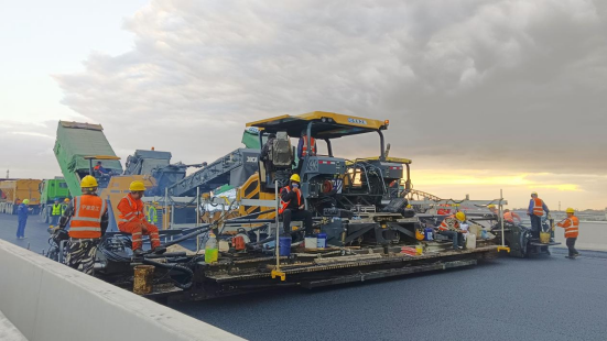 前者展開11.5米超寬“臂膀”精準布料,后者隨即施展“振蕩絕技”,讓瀝青面層空隙率降至4%以下。這對“施工CP”的完美配合,在珠江口海底筑就抗車轍、抗水損的“金剛罩”,形成高平整度、高耐久性的優質路面結構。